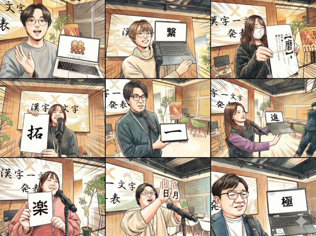 1月7日(水)の夕方より、オフィスエントランス(別名:Co-Creation酒場)にて新春全体会を実施。その後、社員一同での新年会を行いました!新春全体会では一人ひとりが今年の目標を「漢字一文字」に表して発表。約30名の社員一人ひとりが想いを乗せて決意を語り合いました。